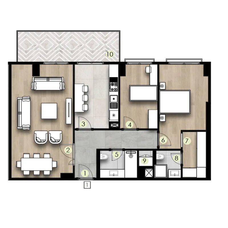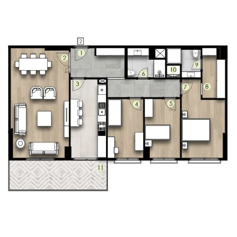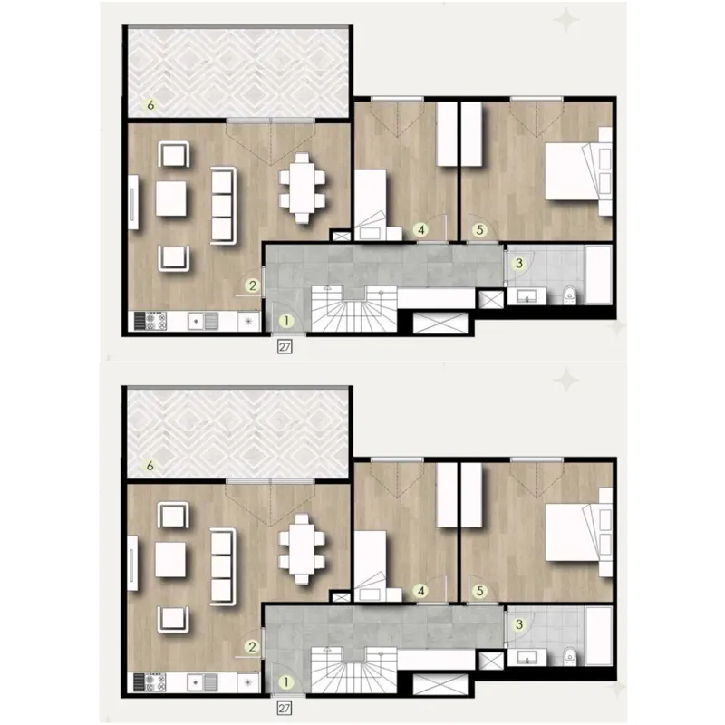 | الانماط | الغرف | الصالات | المساحة | السعر | مخطط الشقة |