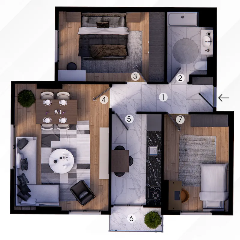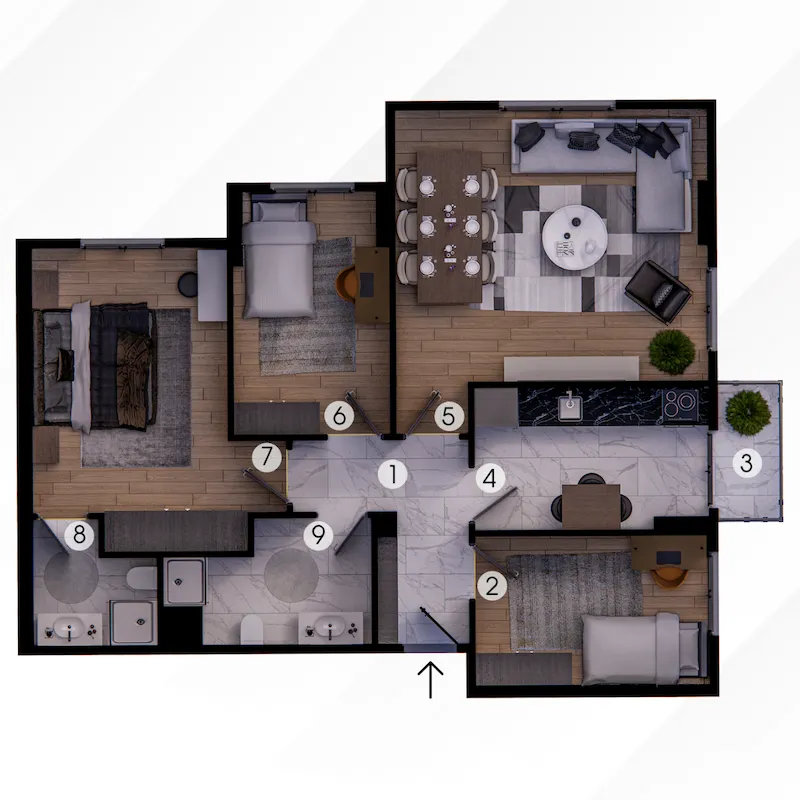 | الانماط | الغرف | الصالات | المساحة | السعر | مخطط الشقة |