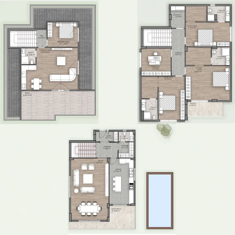 تتمتع بعض الفلل بحديقة خاصة ومسبح خارجي خاص كما انها تتمتع باطلالة على البحر ، مع توفير مساحة واسعة لتعيش بشكل مريح ، تتوفر أيضًا حياة آمنة في مجمع الفلل هذا. مشروع يقدم الحياة التي طالما حلمت بها في اسطنبول. نظرًا لتوفير حياة هادئة بالقرب من البحر ، ستتمكن من أخذ نفس منعش وقتما تشاء.