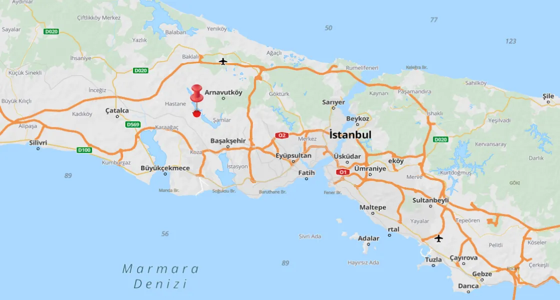 For sale, a piece of land with an area of 10,000 square meters, distinguished as the first plot on the Istanbul Canal in the Arnavutkoy area, specifically in Sazlıbosna. After the partition, it will remain as a single plot within a vibrant area with ready infrastructure.