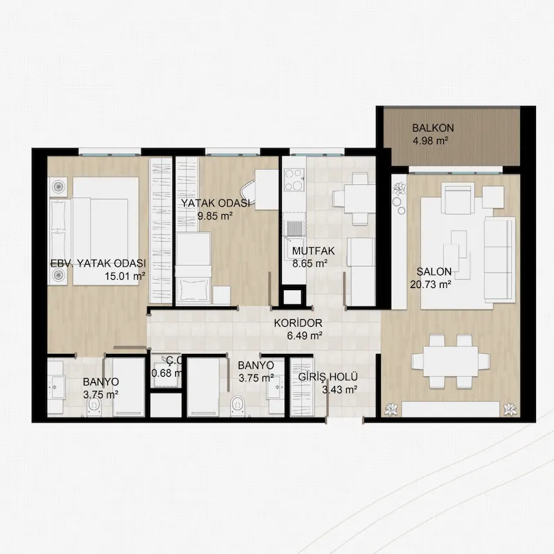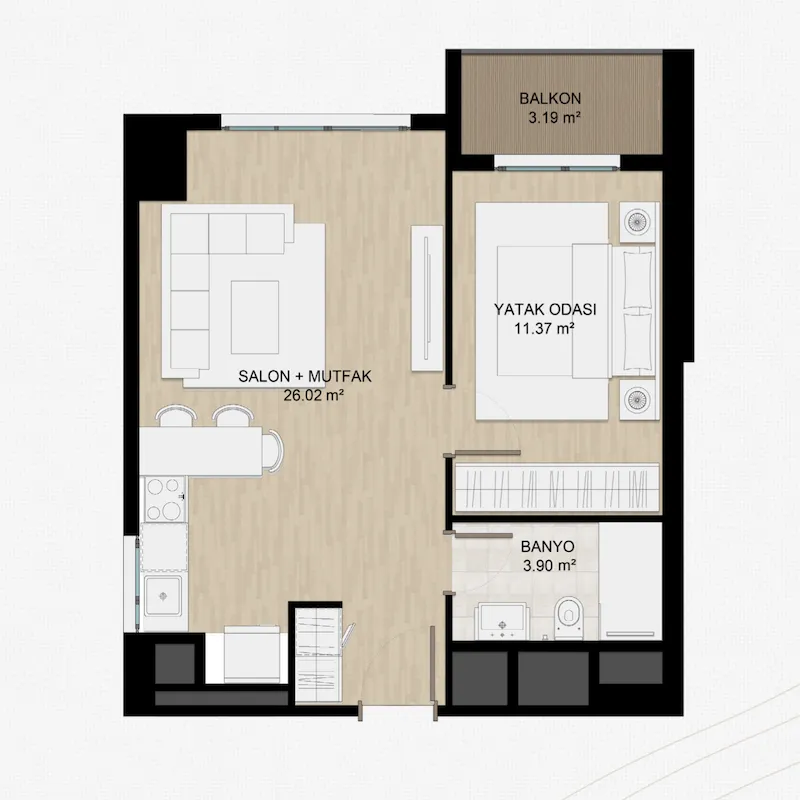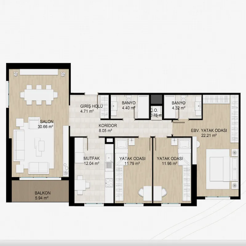 The project, which is located in the Beylikdüzü area and directly opposite the Guzelyurt station on the E5 line and on the European side of Istanbul, was built on a land of 18,000 square meters. It consists of 3 buildings or towers with a height of 26 floors, so that the number of Residential apartments: There are 747 apartments for sale in Turkey, with options starting from 1+1 up to 3+1, and with areas starting from 74 up to 204 square meters.