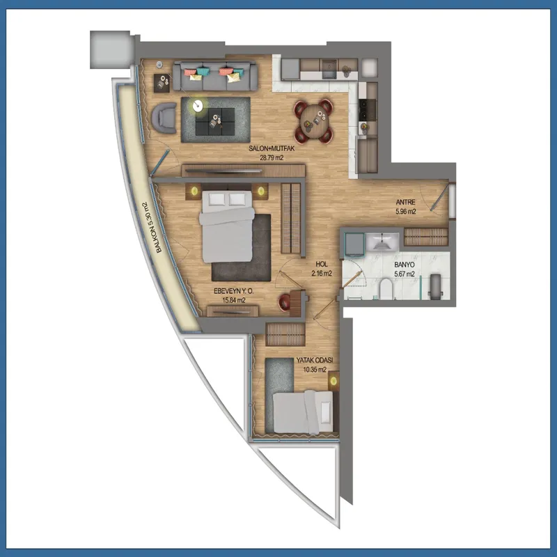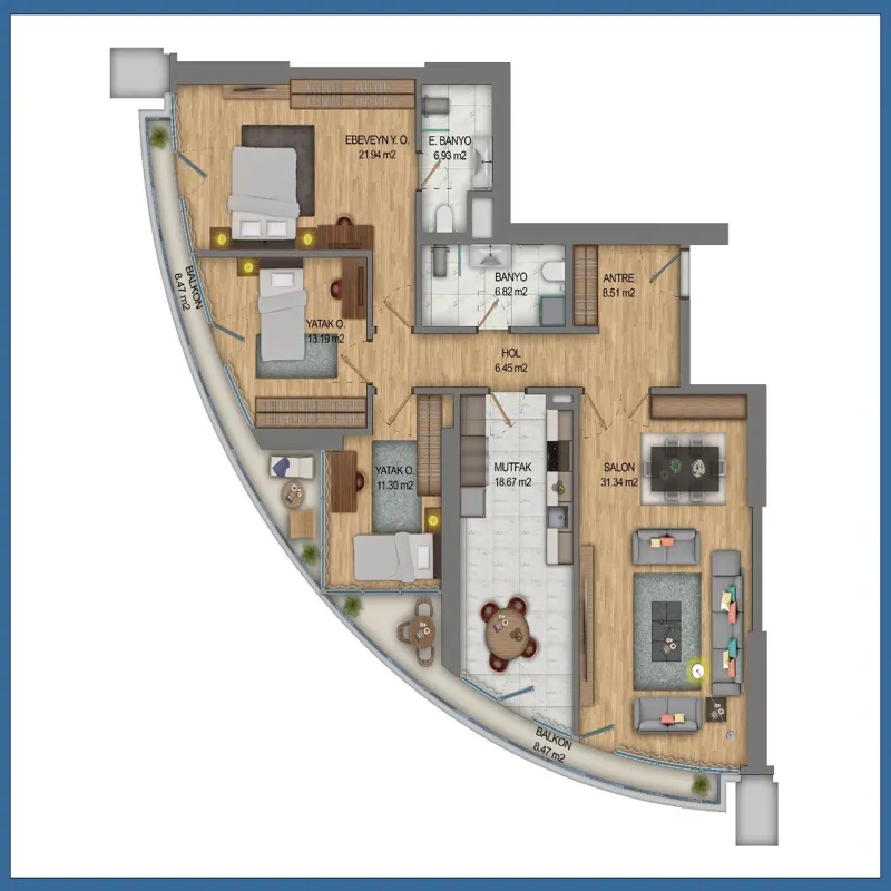 This project was built on a land area of 23,000 square meters, and it consists of 8 residential buildings with a height of 23 floors, a project that offers 1049 apartments for sale in Istanbul, with options starting from 1 + 0 to 3 + 1, so that the real estate areas in it range from 78 to 195 Square meters .
