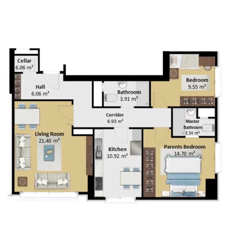 The apartments have many services including swimming pools, children's playgrounds, football fields, walking paths, Turkish bath, sauna, security, and car parking.