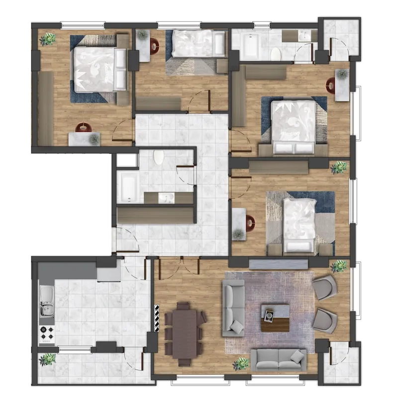 Each apartment features a stunning sea view and is a 5-minute walk from Gurpinar Beach. The total number of apartments is 57 residential properties and apartments for sale in Beylikduzu. There are currently options of apartments with areas starting from 102 up to 250 square meters with options ranging from 2+1, 3+1, 4+1, and 4+2 duplex apartments, in addition to 24-hour security services for a peaceful residential environment.