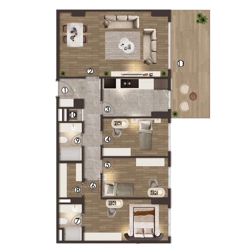 The project was built on a land area of 6868 square meters and it consists of 3 buildings or residential blocks with a height of 8 floors. The total number of apartments in it is 157 apartments or residential properties, in which there are options of apartments starting from 2 + 1 and 3 +1, with areas ranging from 122 to 217 square meters. The project also includes 8 shops. The apartments are equipped with high quality building materials. Thus, you will raise your standard of living. The project apartments offered for sale combine beauty and comfort, and provide spacious living spaces to suit all tastes.