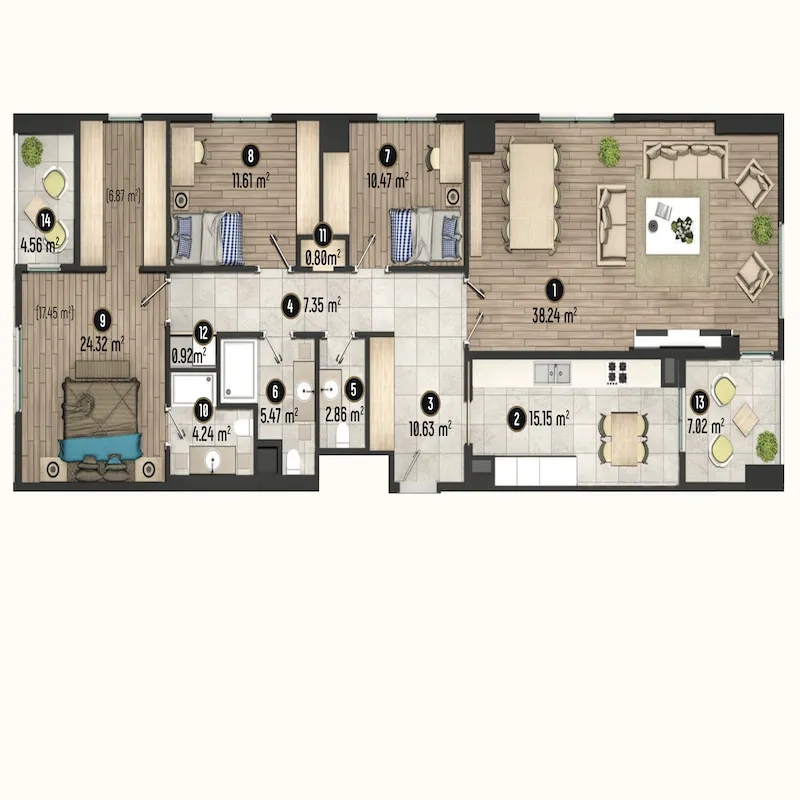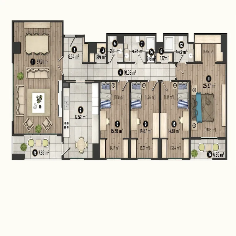 The project was built on a land area of 28,530 square meters and consists of 14 buildings or residential blocks with a height of 17 floors, so that the total number of apartments in it is 1070 residential properties, currently there are options of apartments from 1 + 1 to 7 + 2 with areas starting from 72 to 388 square meters. Everything you need will be found in this project, as it offers a wide and varied range of real estate options at excellent prices.