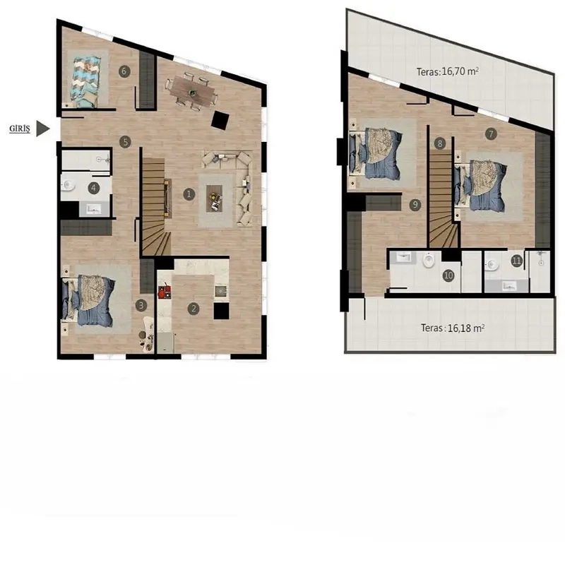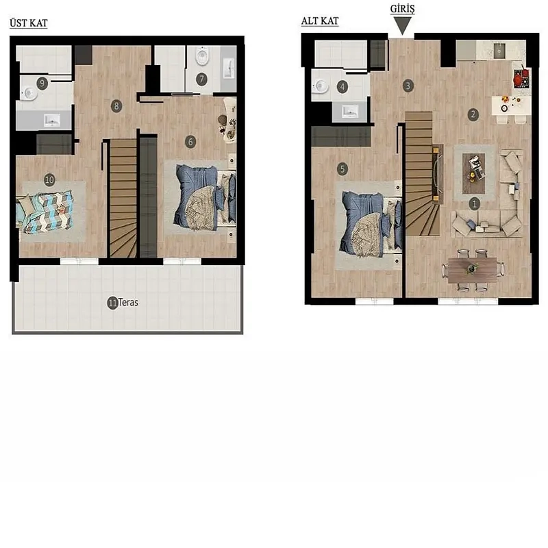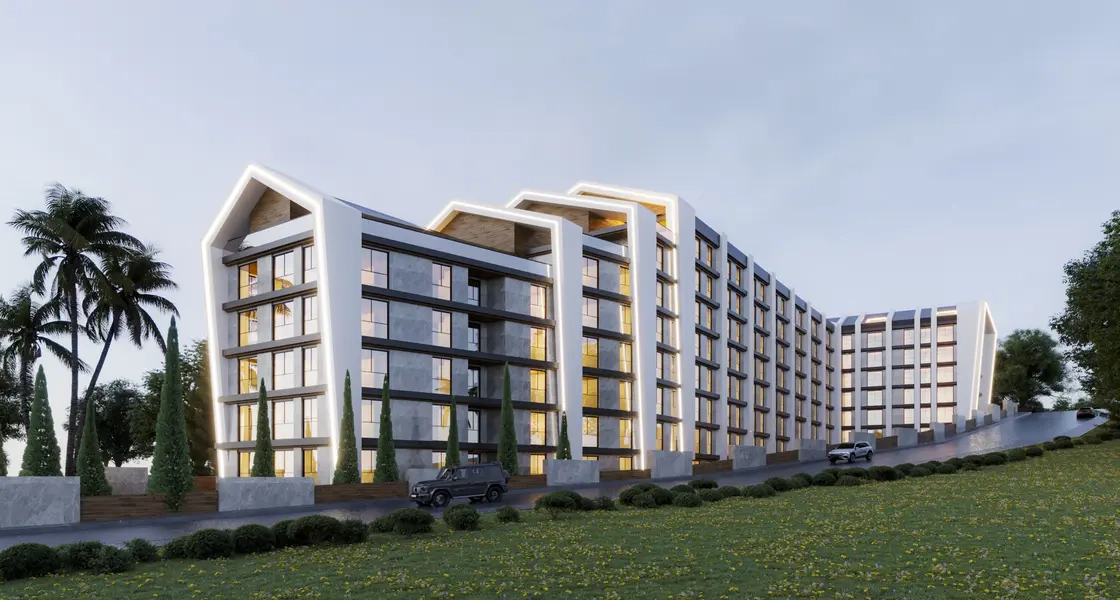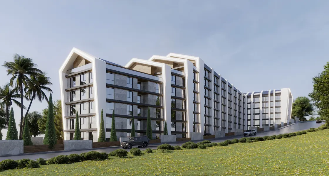 The project is built on an area of 4,000 square meters, providing spacious apartments. It consists of 2 residential buildings, each 6 stories high, with a total of 180 apartments or residential units. Currently, there are options starting from 1+1 up to 4+1, with sizes ranging from 64 to 240 square meters. The project also offers duplex apartments in various styles, and all apartments have stunning views of the greenery.