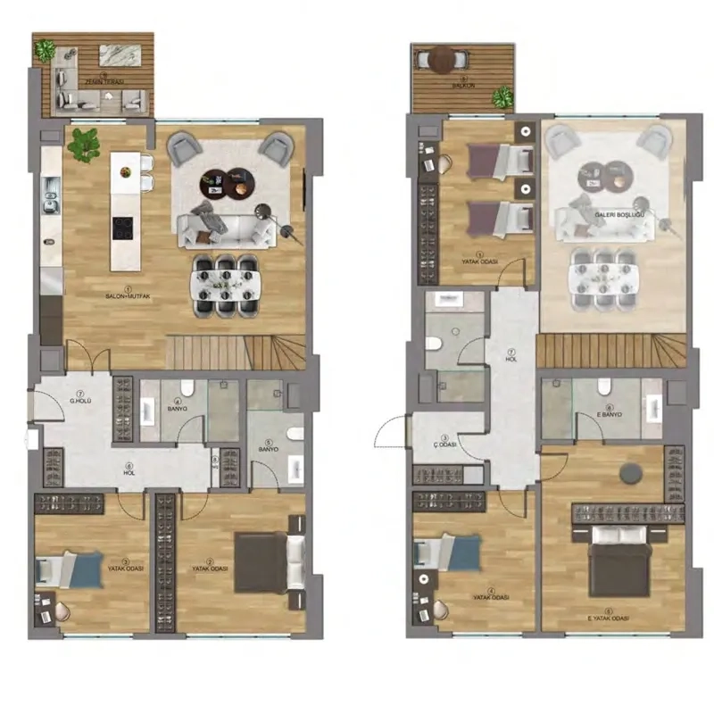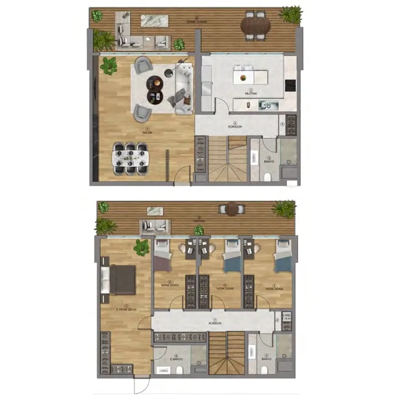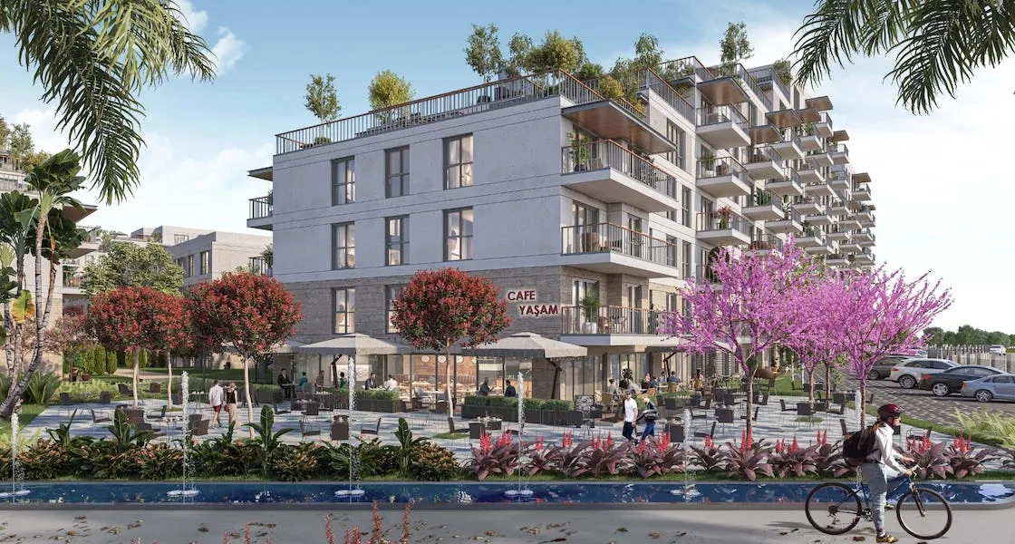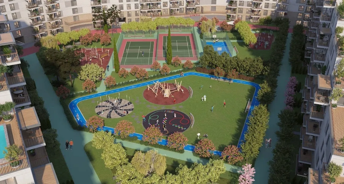 • The area with natural landscapes spans 44,000 square meters and includes a swimming pool, fitness center, sauna, Turkish bath, steam room, playgrounds for the new generation, a water park, jogging and walking paths, a basketball court, tennis courts, recreational areas, and large green spaces. These areas are designed for enjoyable times.